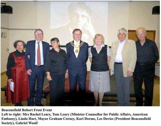The event – which vividly brought to life the time that Robert Frost and his family lived in Beaconsfield – was a real Anglo-American occasion. Tom Leary (the Minister Counsellor for Public Affairs at the American Embassy) and his wife were among our VIP guests. They enjoyed it so much that they said they wanted to come to the Society’s next event in November at Penn church.